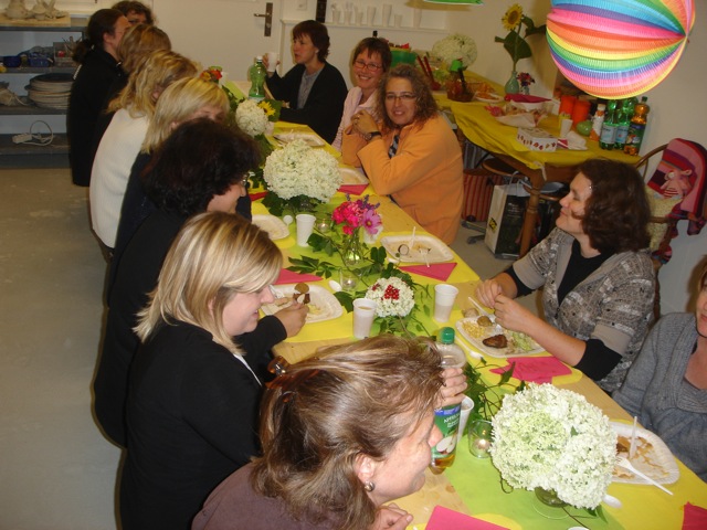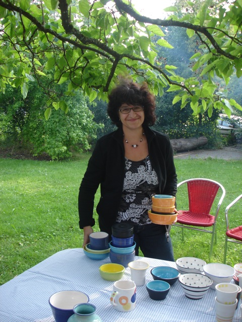 Am 10. Juli stieg das Sommerfest für alle aktiven und einigen ehemaligen „Drehkursfrauen“ der Töpferei zur Held. Da es eher kühl war an diesem Abend, mussten wir in der Töpferei essen. Die Vernissage aber und natürlich das Brätle fanden draussen statt. Und dann mussten die Frauen auch noch arbeiten...