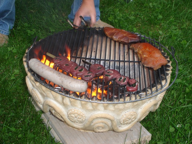 Es ist immer wieder eine Überraschung, die eigene Keramik nach dem Glasurbrand zu sehen. Endlich kann man die Stücke an denen zum Teil lange gearbeitet wurde in fertigem Zustand sehen. Auch an dieser Vernissage gab es viel zu bewundern. Schon bald prasselte das Feuer in den zwei Feuerschalen und wir waren froh, um die angenehme Wärme, die davon ausging. Nach und nach zogen wir die Stühle zum Feuer und schauten den brutzelnden Leckereien zu. Nochmals vielen Dank an alle Frauen für die feinen Salate, Desserts und Apéros, die Ihr mitgebracht habt!