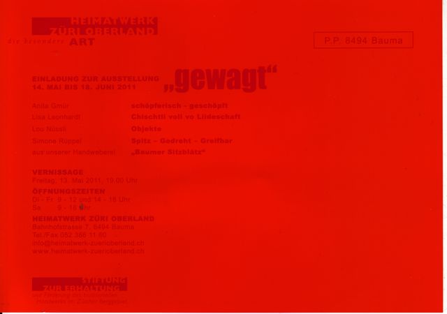 Anbei die Einladungen zu den Ausstellungen. Die erste findet in Bauma im Heimatwerk statt und beginnt just am Freitag den 13. Mai! Soll Glück bringen.