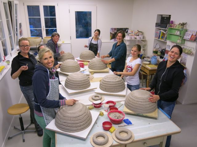 Gestern ist der Kurs „Passion in Ton“ gestartet. Man könnte es auch einfach freies Modellieren nennen. Leider musste jemand krankheitsbedingt absagen, so waren wir nur zu viert. Dafür hatten wir viel Platz und jeder konnte sich grosszügig ausbreiten. Es waren friedliche drei Stunden bei schönstem Wetter. Die Projekte sind mancherlei. Vom Vogelfutterhaus aus meinem Buch, das aus einer Kugel geformt wird über ein Blumenkistchen für Kräuter und Eierbecher war alles da. Nächste Woche, gleiche Zeit, machen wir weiter. Anbei die Bilder.