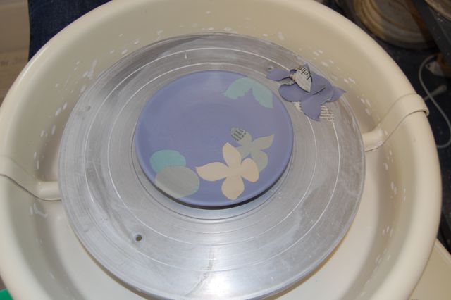 Vor zwei Wochen habe ich im Kurs gezeigt, wie das geht mit Schablonen und Engoben. Engobe ist eingefärbter Tonschlicker, der auf den Lederharten Ton aufgetragen wird. Marlen hat die Herausforderung angenommen und an einem kleinen Tellerchen ihr Glück versucht. Die Schablonen werden aus Zeitungspapier ausgeschnitten. Es empfiehlt sich, schlichte und klare Formen zu wählen. Die ersten Schablonen legt man leicht angefeuchtet direkt auf den Ton, bevor die erste Schicht Engobe aufgetragen wird. Sobald diese leicht angetrocknet ist, legt man weitere Schablonen auf. Schicht um Schicht geht es so weiter. Marlen hat mit grau angefangen, dann kam türkis und mit blau hat sie die letzte Lage gemalt. Zwischendurch darf dem Trockenprozess mit dem Föhn nachgeholfen werden.